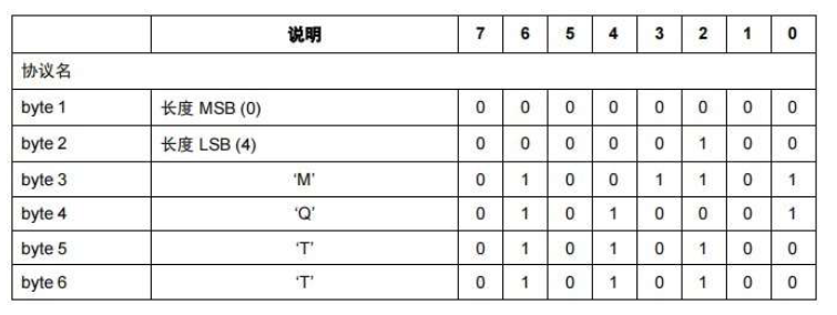而byte3~6则固定为MQTT这四个字符,每个字节保存成一个字符,对应就是4D 51 54 54。