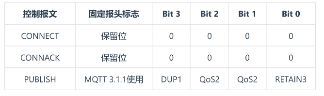 位于byte1的第3~0位,表示MQTT报文的分组类标识。在不使用标识位的消息类型中,标识 位被做为保留位。如果收到无效的标志时,接收端必须关闭网络连接。