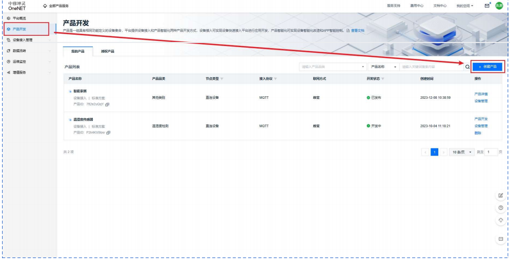 产品:一组具有相同功能定义的设备集合,产品下的资源包括设备、设备数据、设备权限、数 据触发服务以及基于设备数据的应用等多种资源,用户可以创建多个产品。