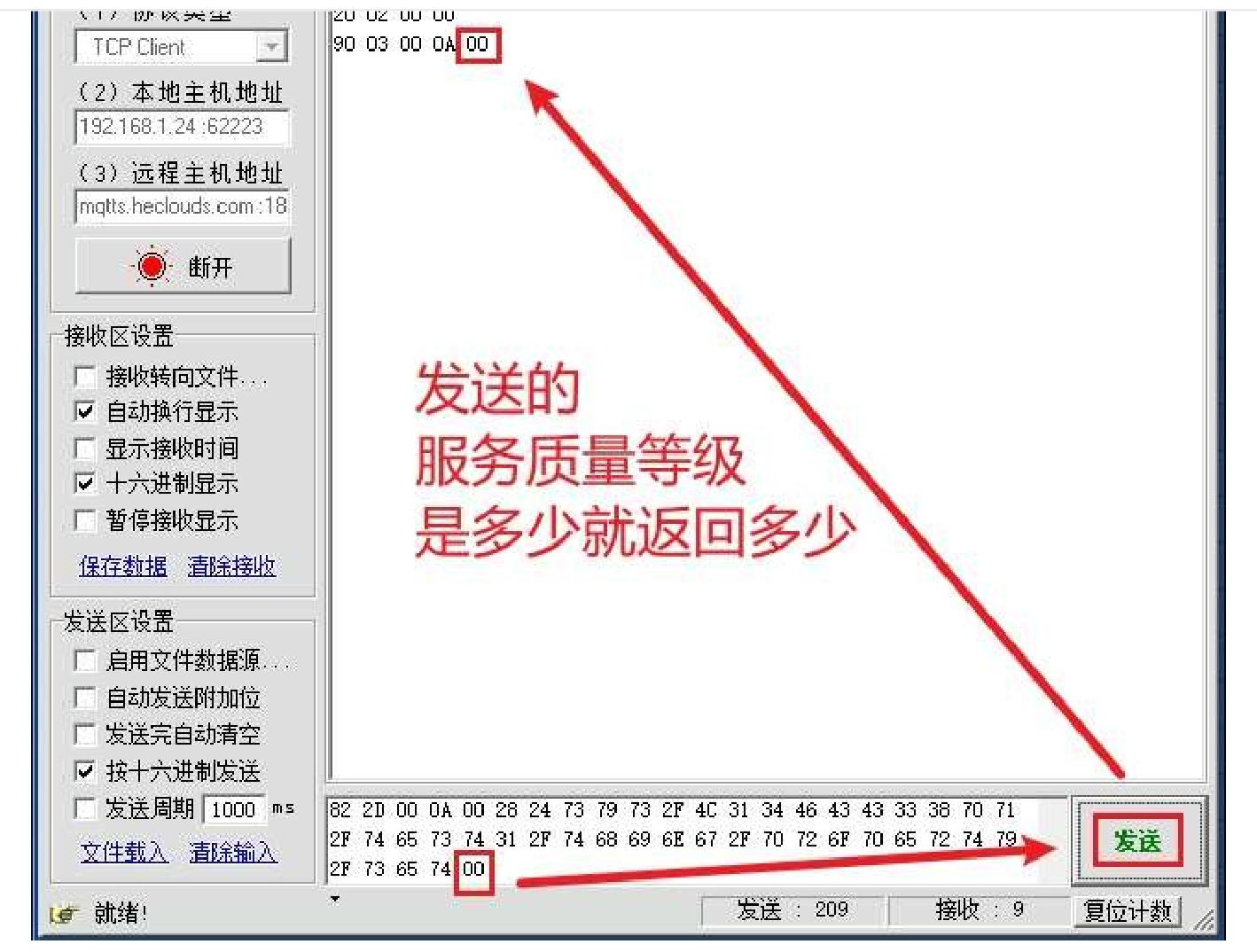 上一次发送我们设置的服务质量等级是00,返回了00。如果我们服务质量等级改成01,那么 SUBACK最后一位将返回了01。