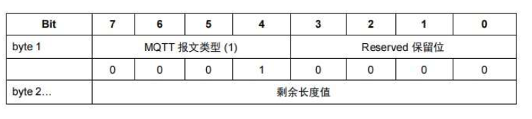 接着以CONNECT报文为例,结构如下图,固定报头中消息类型是1,标志位是0000,所以第一 字节是00010000,转成十六进制是10,剩余长度未知,所以CONNECT报文固定报头的十六进 制是:10XX。
