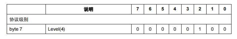 协议级别,只由1个字节组成,对于协议MQTT3.1.1协议级别的值是4,结构如下图,转成十六 进制是04。