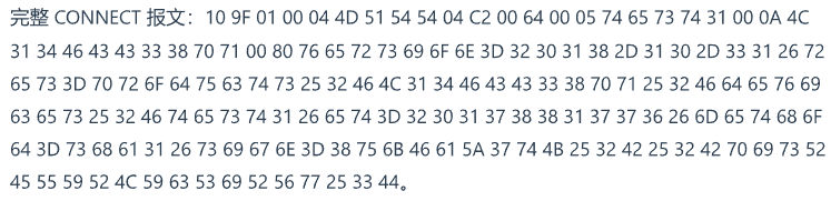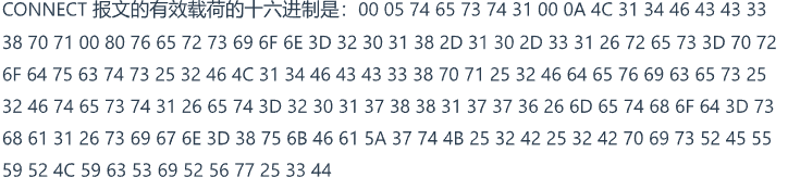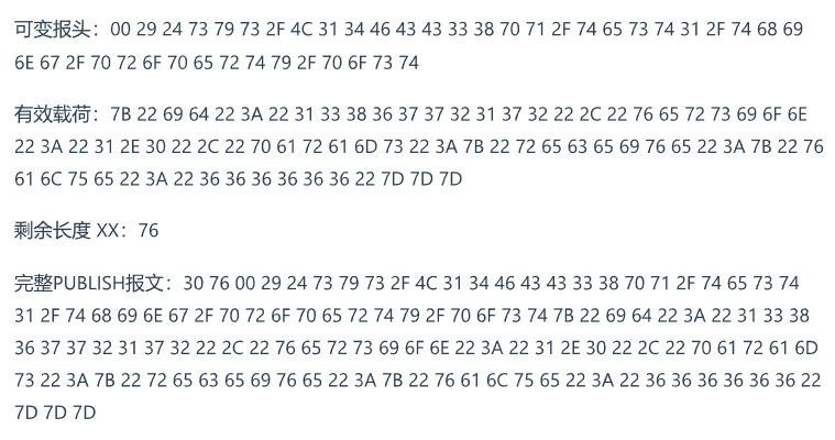 $sys/L14FCC38pq/test1/thing/property/post转成十六进制是:24 73 79 73 2F 4C 31 34 46 43 43 33 38 70 71 2F 74 65 73 74 31 2F 74 68 69 6E 67 2F 70 72 6F 70 65 72 74 79 2F 70 6F 73 74。共41个字符,加上长度前缀0029,可变报头为:00 29 24 73 79 73 2F 4C 31 34 46 43 43 33 38 70 71 2F 74 65 73 74 31 2F 74 68 69 6E 67 2F 70 72 6F 70 65 72 74 79 2F 70 6F 73 74。