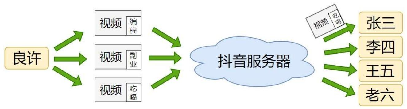 良许如果「发布」了一条视频,那么张三、李四、王五、老六,等等所有关注了良许的粉丝都会 收到这个视频推送。这是因为抖音里没有主题的概念,只要良许有发视频,粉丝都会收到推送。