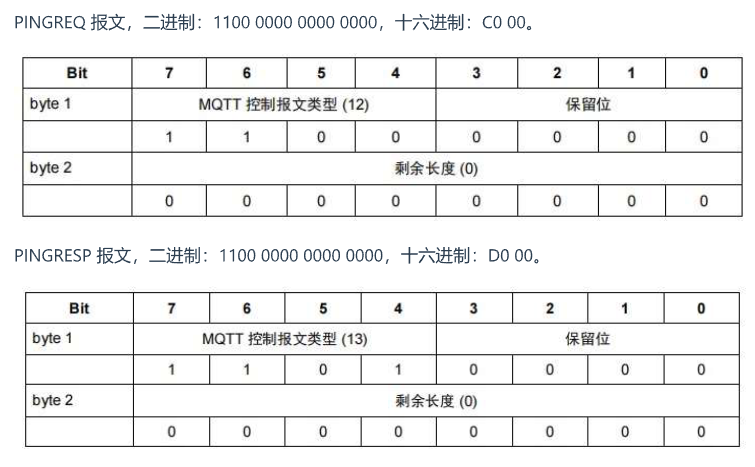 PINGREQ报文,二进制:1100 00000000000,十六进制:CO 00。