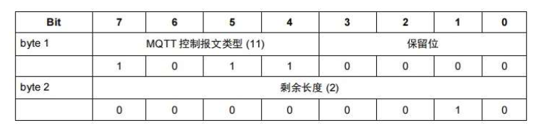 结构如下图,固定报头中消息类型是11,标志位是0000,所以第一字节是10110000,转成十 六进制是BO,剩余长度为2(后面固定有两字节),所以UNSUBACK报文固定报头的十六进制 是:BO 02。