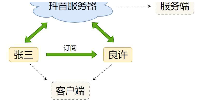 假如你是张三,一名普通的抖音用户,你关注了良许的抖音账号。在这里,张三跟良许不会直接 产生关系,而是会通过抖音服务器。抖音服务器就是「服务端」,所有抖音用户就是[客户 端」,你关注良许的这个动作,就叫作「订阅」。