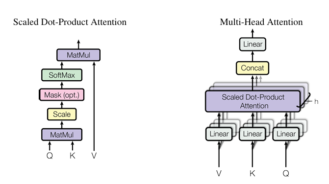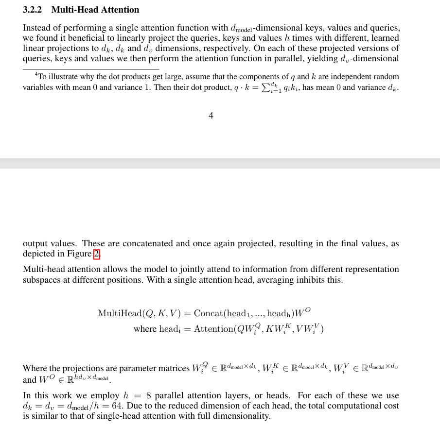 会发现其实代码和论文不是完全一样的,论文看起来是每个头有单独的W去乘,但是代码里是所有头共用W再拆分。其实两者是等价的。要注意一下,在multi-head attention中,输入是不被拆分的,它的shape一直是[L,D_model],拆分的是W,把[D_model, D_model]的矩阵拆分成K个[D_k, D_model]的矩阵。