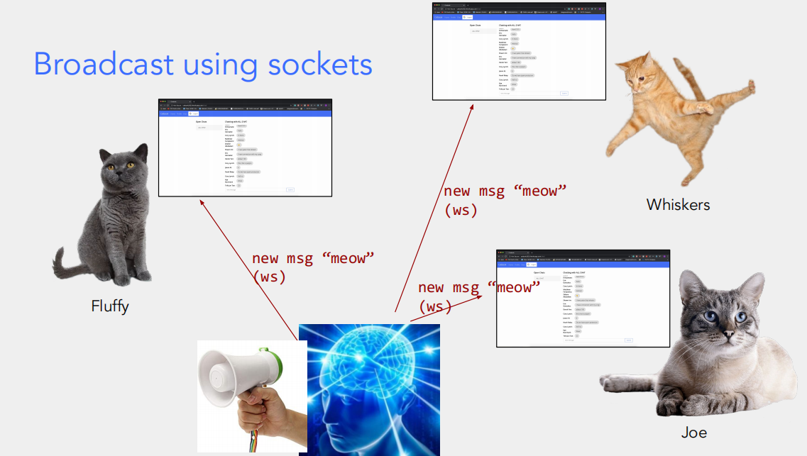 主动推送给所有在线的客户端(Fluffy、Whiskers、Joe 对应的界面)。 - 核心:WebSocket 建立连接后,服务器能主动 “广播” 数据给多个客户端,不需要客户端反复发 HTTP 请求,完美解决了 HTTP 无法主动推送的局限性。