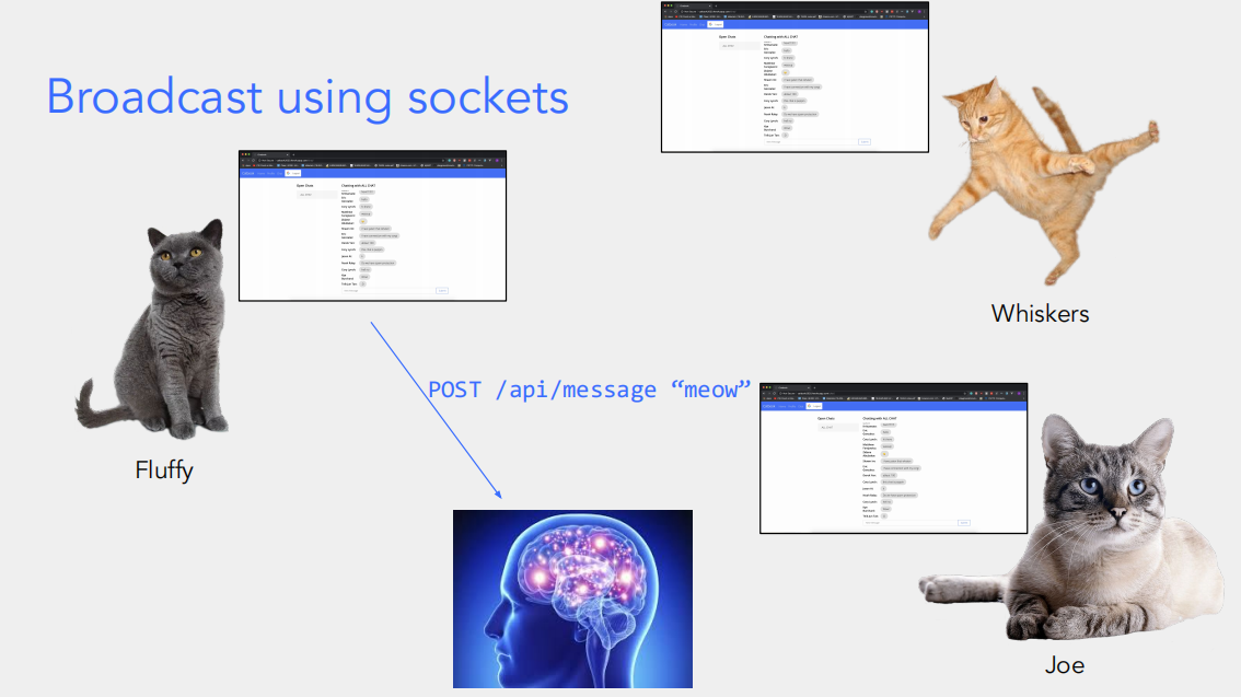 (HTTP 请求)把消息 “meow” 发给服务器(中间大脑图标)。 - 目的:这一步是客户端向服务器提交消息,和之前 HTTP 的 “请求 - 响应” 类似,但重点在后续服务器怎么把消息 “广播” 给所有人。
