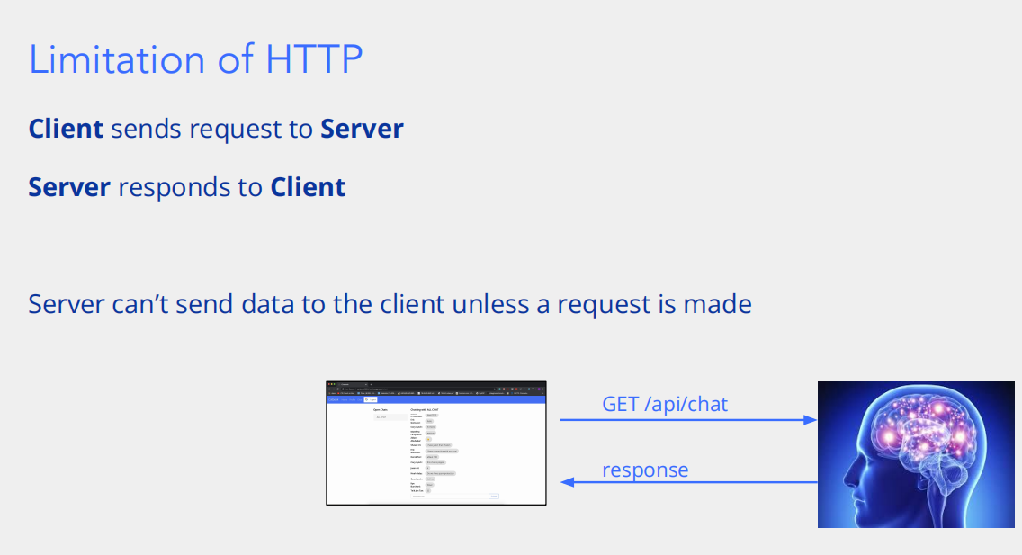 HTTP(超文本传输协议)的一个核心局限性:通信是 “请求 - 响应” 模式,且由客户端(Client)主动发起,服务器(Server)无法 “主动推送” 数据给客户端,除非客户端先发送请求。