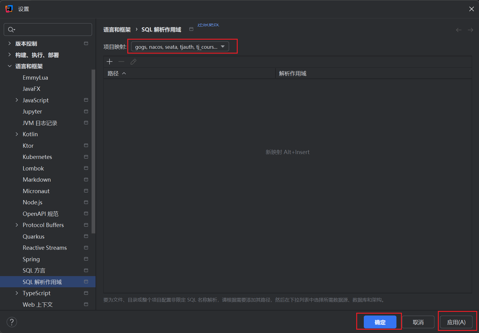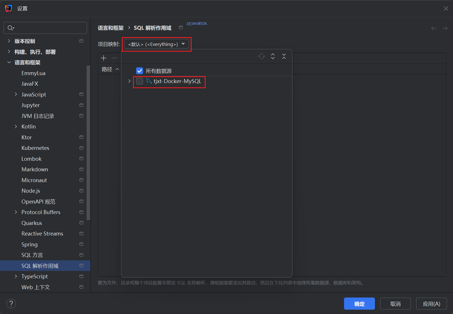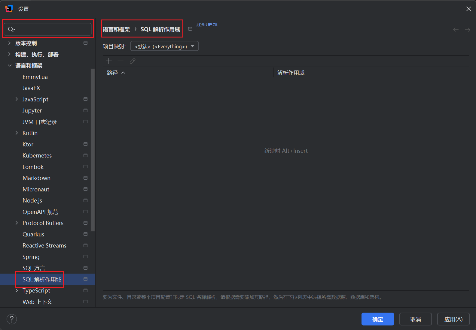 在设置界面,可以通过依次点击语言或框架、SQL解析作用域,也可以直接通过搜索框进行搜索(更快捷方便)