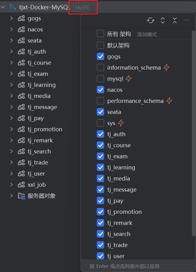 但是如果你切换其他项目或者是关掉这个项目再重新打开,你会发现边框消失同时又得重新选择架构,明显感觉就是治标不治本。所以下面会给出配置之后不再出现无法解析表的解决办法,就是设置SQL解析作用域