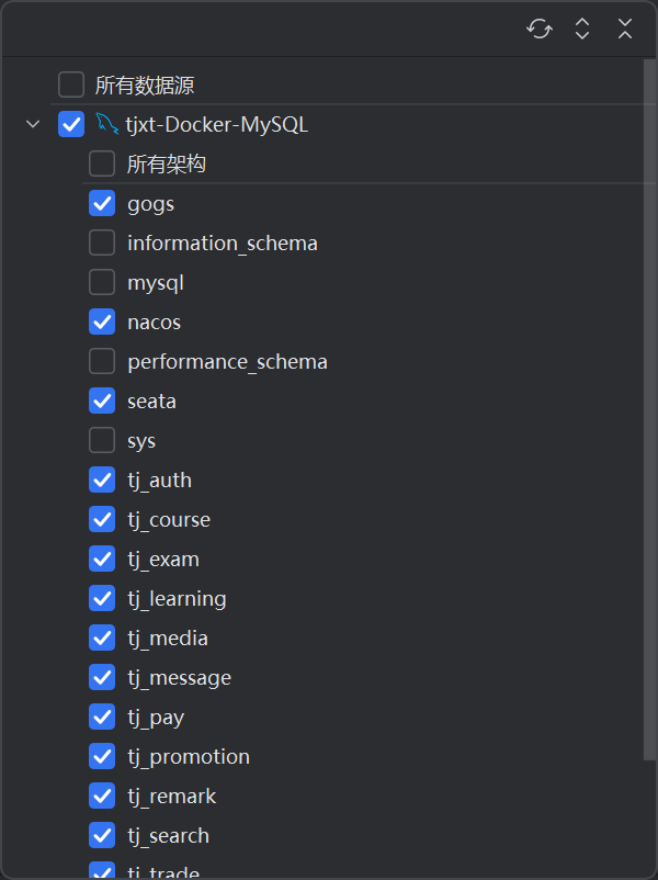 然后点击项目映射处的默认(Everything),去掉所有数据源的勾子,改为选择刚刚连接的项目数据库(这里必须完成前置的连接数据库,不然这里所有数据源啥都不显示)
