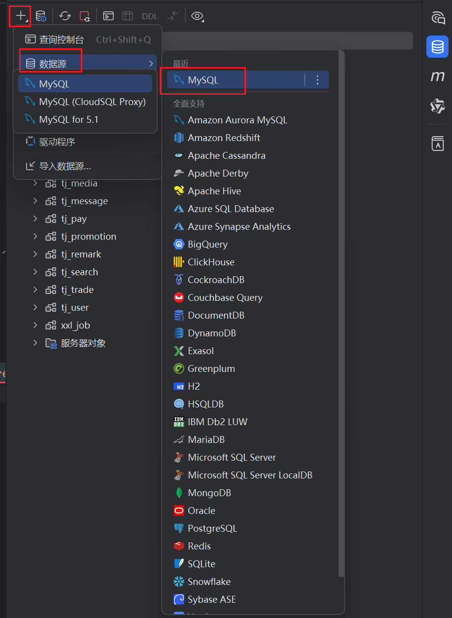 依次点击加号、数据源、MySQL