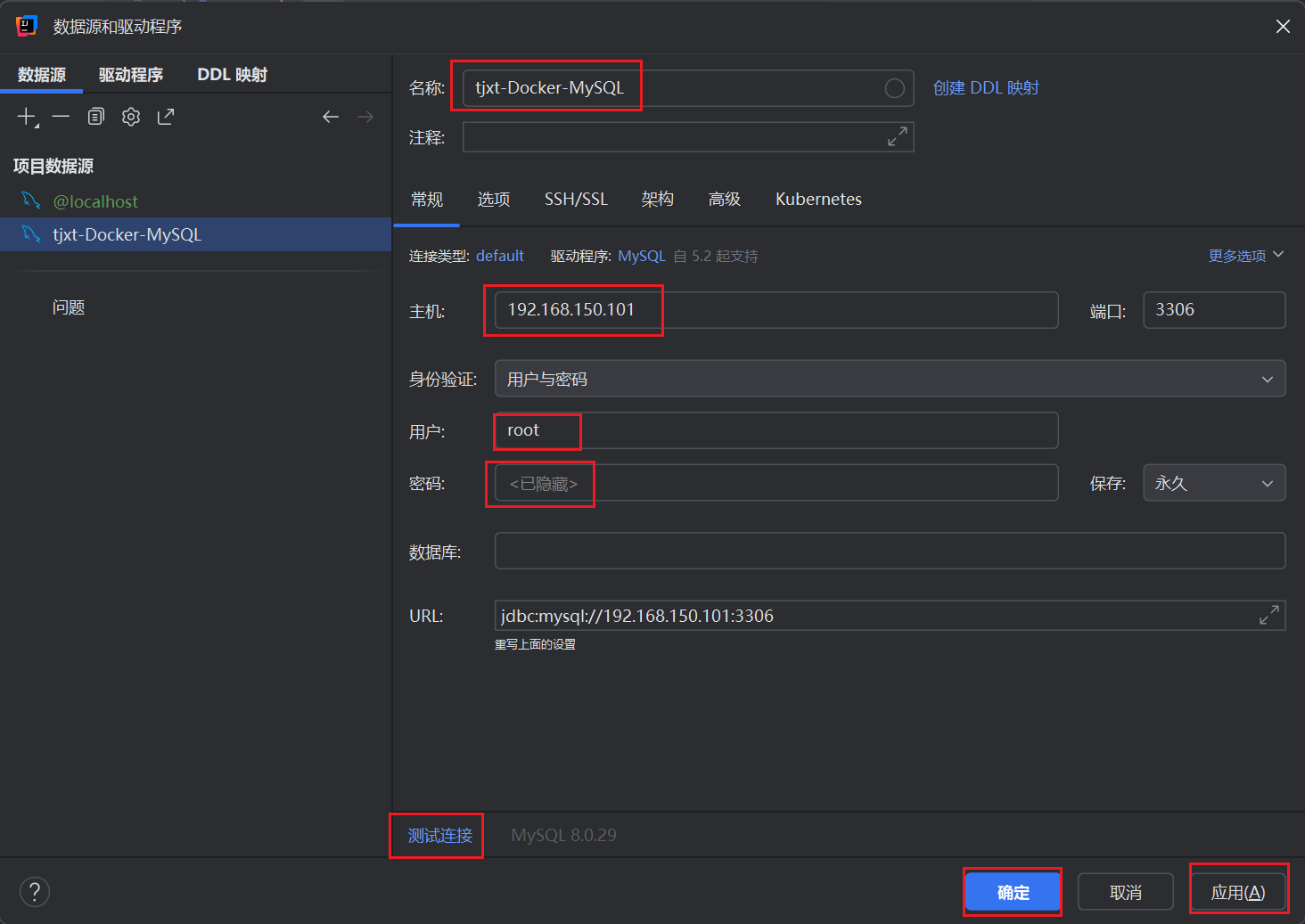这里名称自己写,然后主机把默认的localhost改为192.168.150.101,用户填入root,密码就是123.然后测试连接,显示测试成功就点击应用再点击确定即可