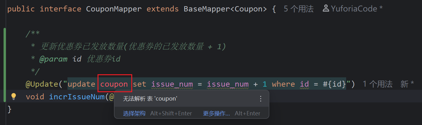 天机学堂day10领取优惠券接口编写mapper层sql语句时无法解析表的解决办法(更加完整、详细图解)