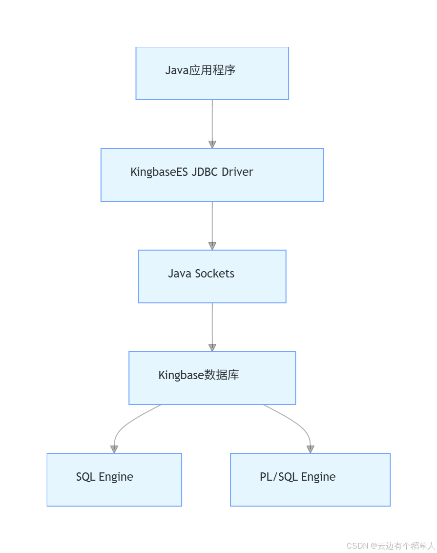 KingbaseES JDBC 驱动的体系结构如下图所示,清晰地展示了 Java 应用通过 JDBC 驱动与 KingbaseES 数据库之间的交互流程: