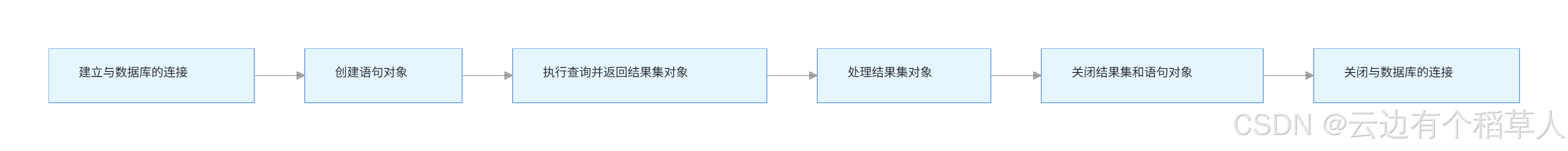 - 处理结果集对象:遍历 ResultSet 对象,读取其中的数据并进行相应的业务处理,如数据展示、数据计算等;如果是更新操作(如 INSERT、UPDATE、DELETE),则获取更新的行数等执行结果。