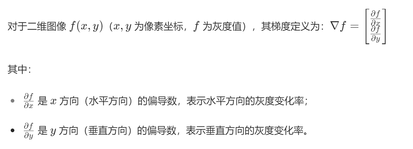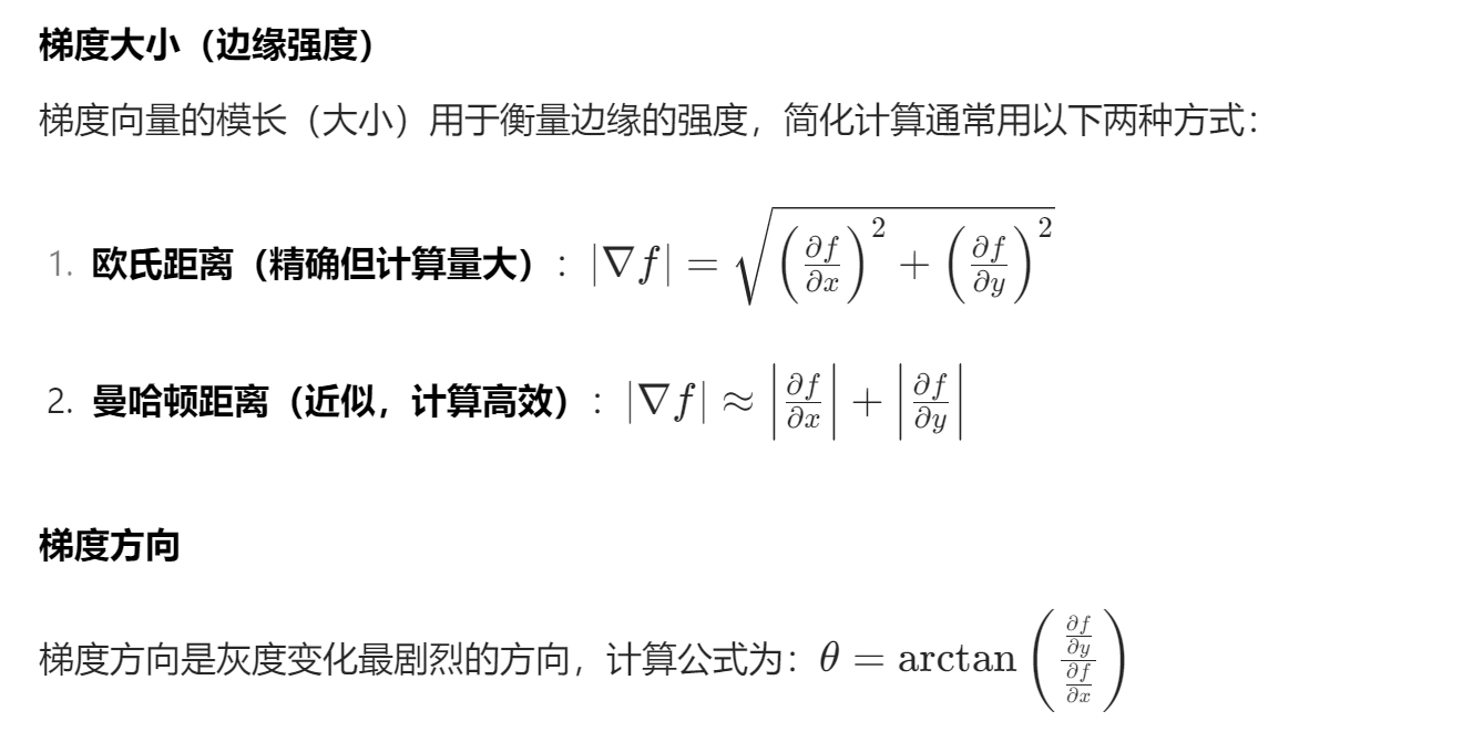 梯度本质上是一个向量,包含方向(灰度变化最剧烈的方向)和大小(灰度变化的强度)。在实际应用中,通常用梯度大小来表示边缘的明显程度(值越大,边缘越清晰)。