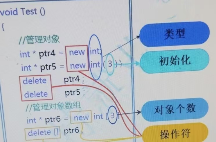 int* p1 = new int;int* p2 = new int[10];delete p1;delete[] p2;int* p3 = new int(0);int* p4 = new int[10] {0};int* p5 = new int[10] {1, 2, 3, 4, 5};delete p3;delete[] p4;delete[] p5;