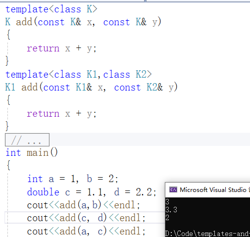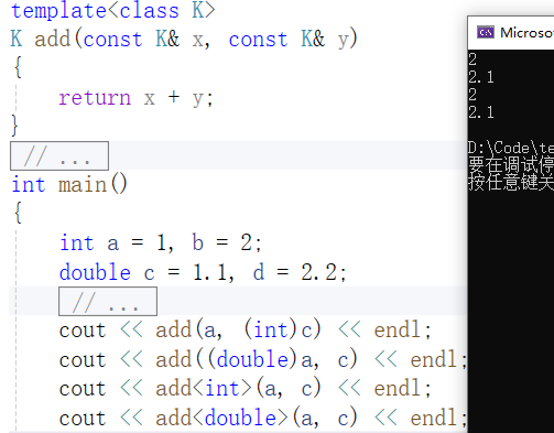 {int a = 1, b = 2;double c = 1.1, d = 2.2;cout << add(a, (int)c) << endl;cout << add((double)a, c) << endl;cout << add<int>(a, c) << endl;cout << add<double>(a, c) << endl;return 0;