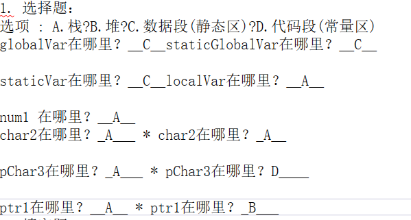 如(2)所示,globalVar为全局变量,故在静态区,staticGlobalVar、staticVar均为static修饰的静态变量,故也在静态区,localVar为局部变量,故在栈中,num1为数组名,即数组首元素的地址,即num1为局部指针变量,也在栈中,同理char2也在栈中,*char2即为数组首元素,为局部变量,故也在栈中,pChar3为局部指针变量,故也在栈中,*pChar3为常量字符串,为只读常量,故在常量区,ptr1为局部指针变量,故在栈中,*ptr1为malloc动态开辟的空间,故在堆上。