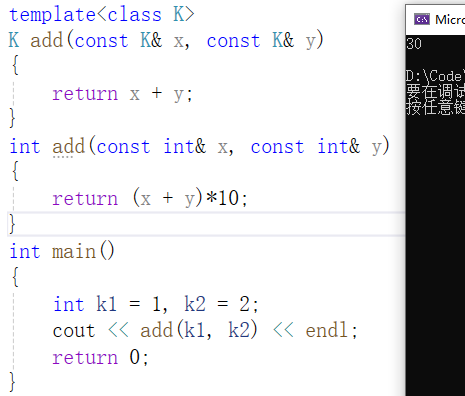 如(9)所示,编译器选择调用函数add,故结果为(1+2)*10=30。