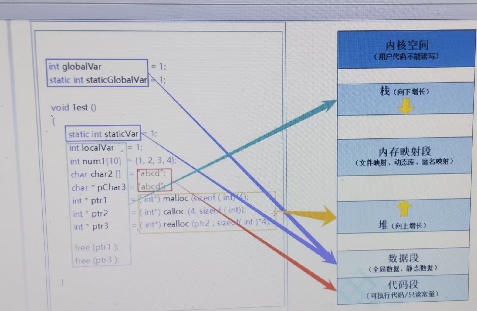 {static int staticVar = 1;int localVar = 1;int num1[10] = { 1, 2, 3, 4 };char char2[] = "abcd";const char* pChar3 = "abcd";int* ptr1 = (int*)malloc(sizeof(int) * 4);int* ptr2 = (int*)calloc(4, sizeof(int));int* ptr3 = (int*)realloc(ptr2, sizeof(int) * 4);free(ptr1);free(ptr3);