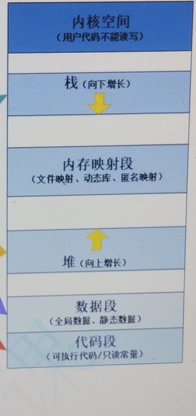 C++内存区域划分与C的内存区域划分一致,具体可分为6个区域:内核空间、栈、内存映射段、堆、数据段(静态区)、代码段(常量区),内核空间区域用户代码不能读写,栈往内存向下的方向生长,内存映射段包括文件映射、动态库、匿名映射,堆往内存向上的方向生长,数据段的数据主要包括全局数据、静态数据,代码段的内容包括可执行代码、只读常量。