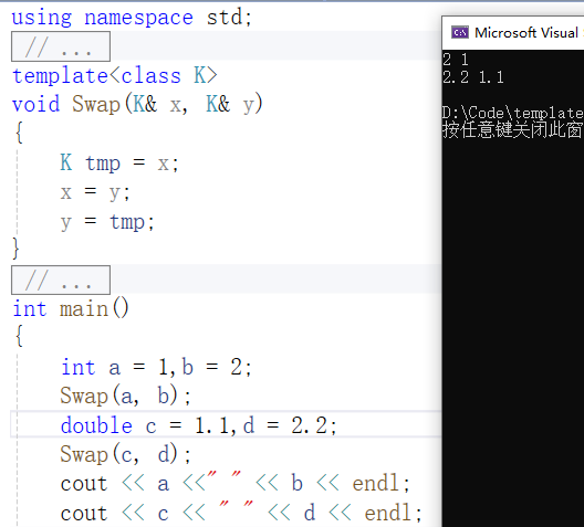 template为定义模板的关键字,定义格式为template<class K>,K代表具体类型,用于Swap函数参数的类型名,引用作为参数可以减少拷贝,Swap函数内部完成两个数的交换,这就是Swap的函数模板,该模板可以完成两个任意类型的数据交换。
