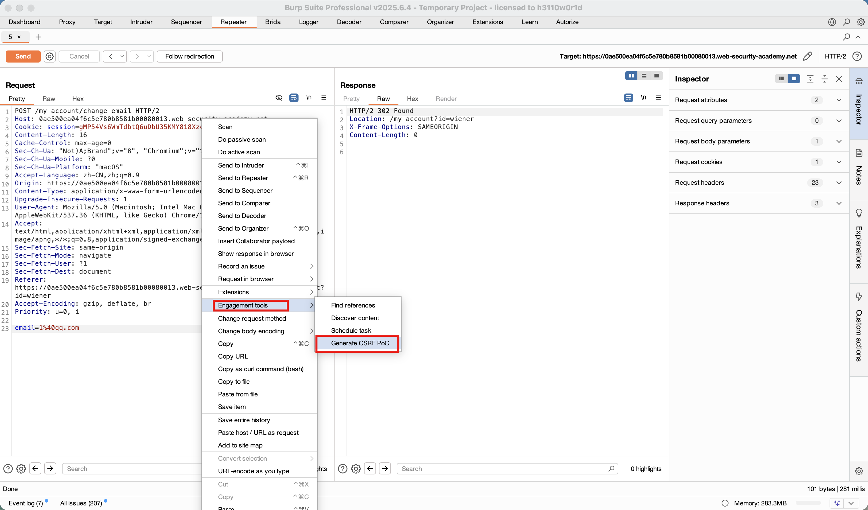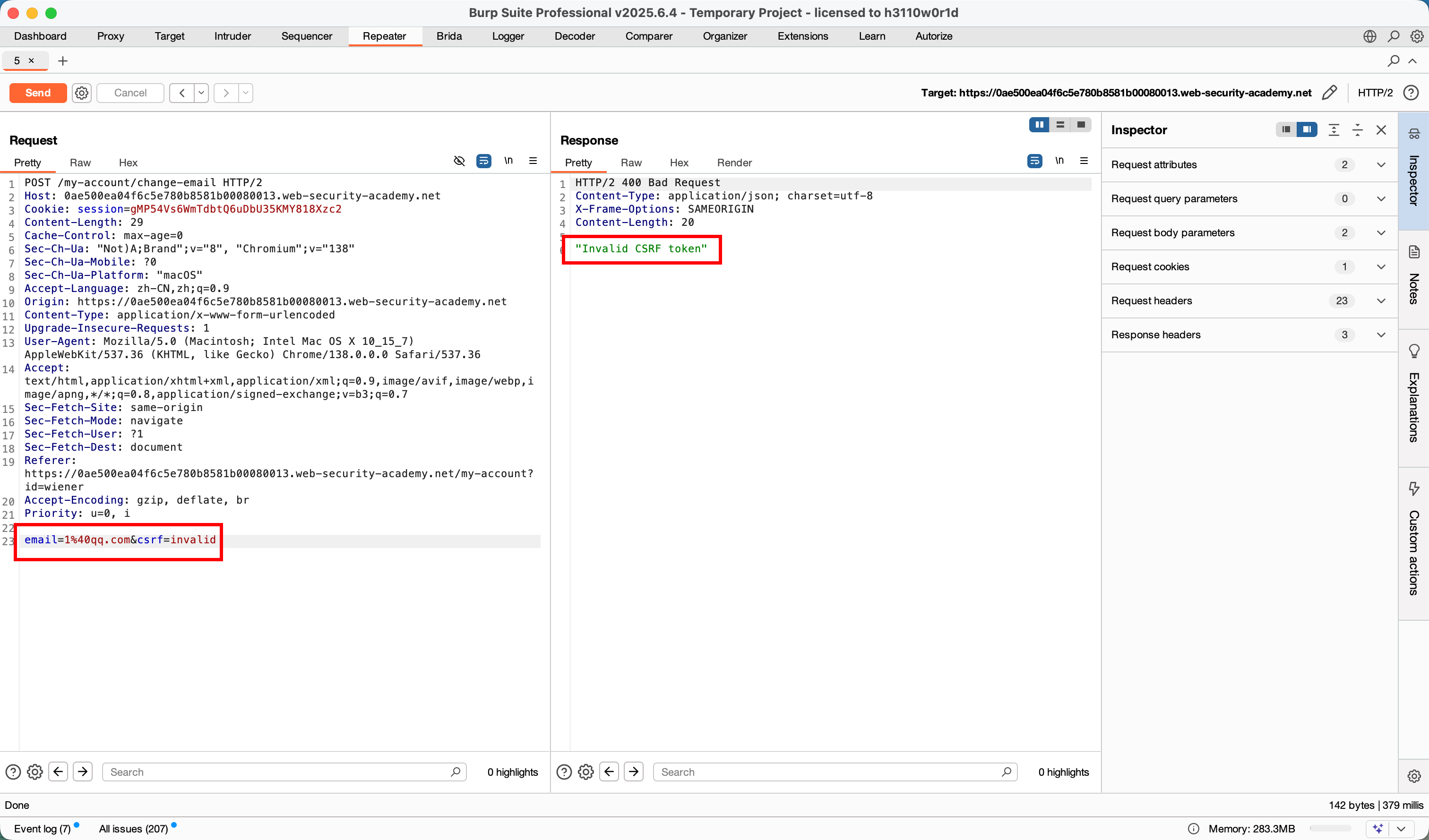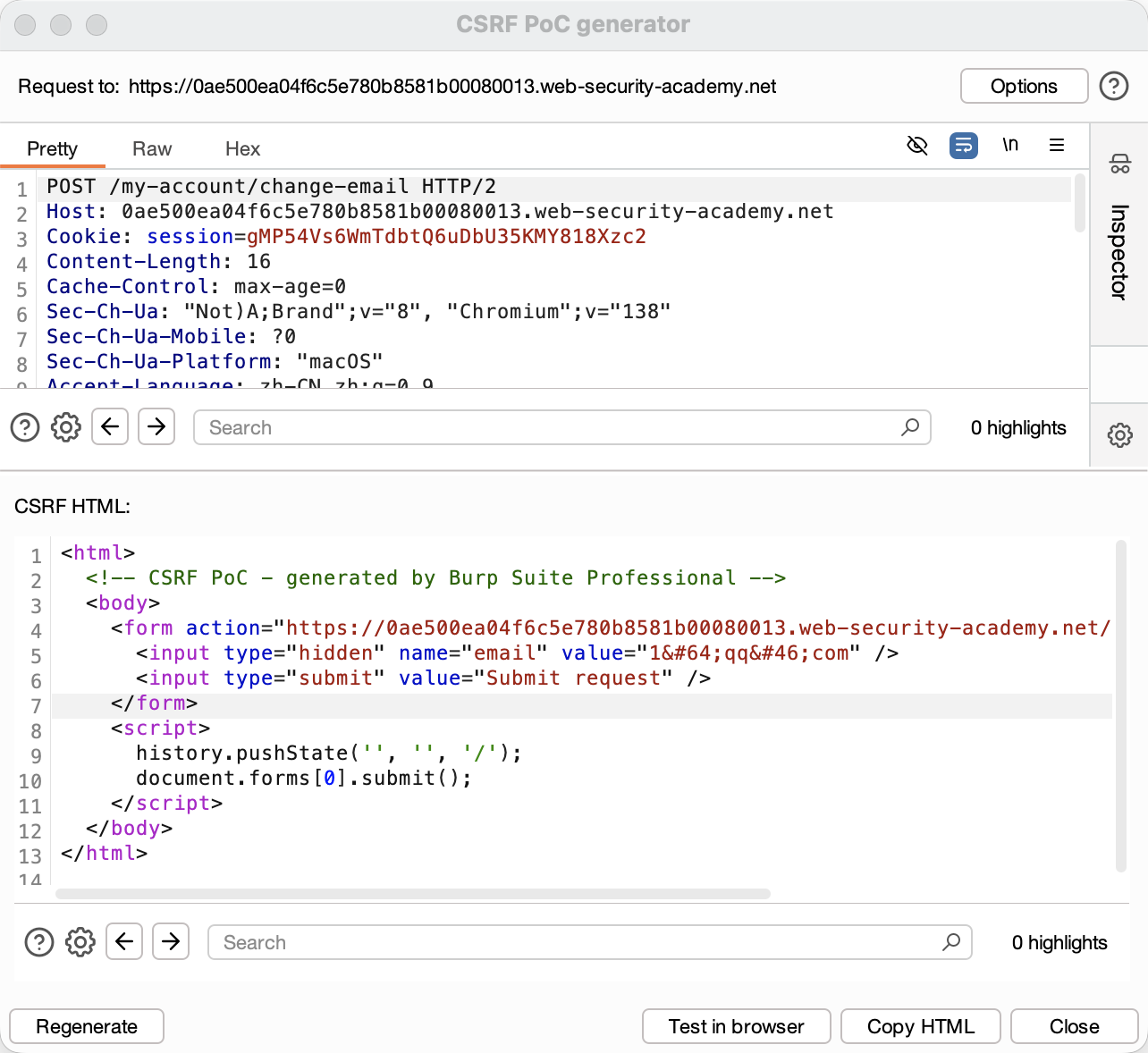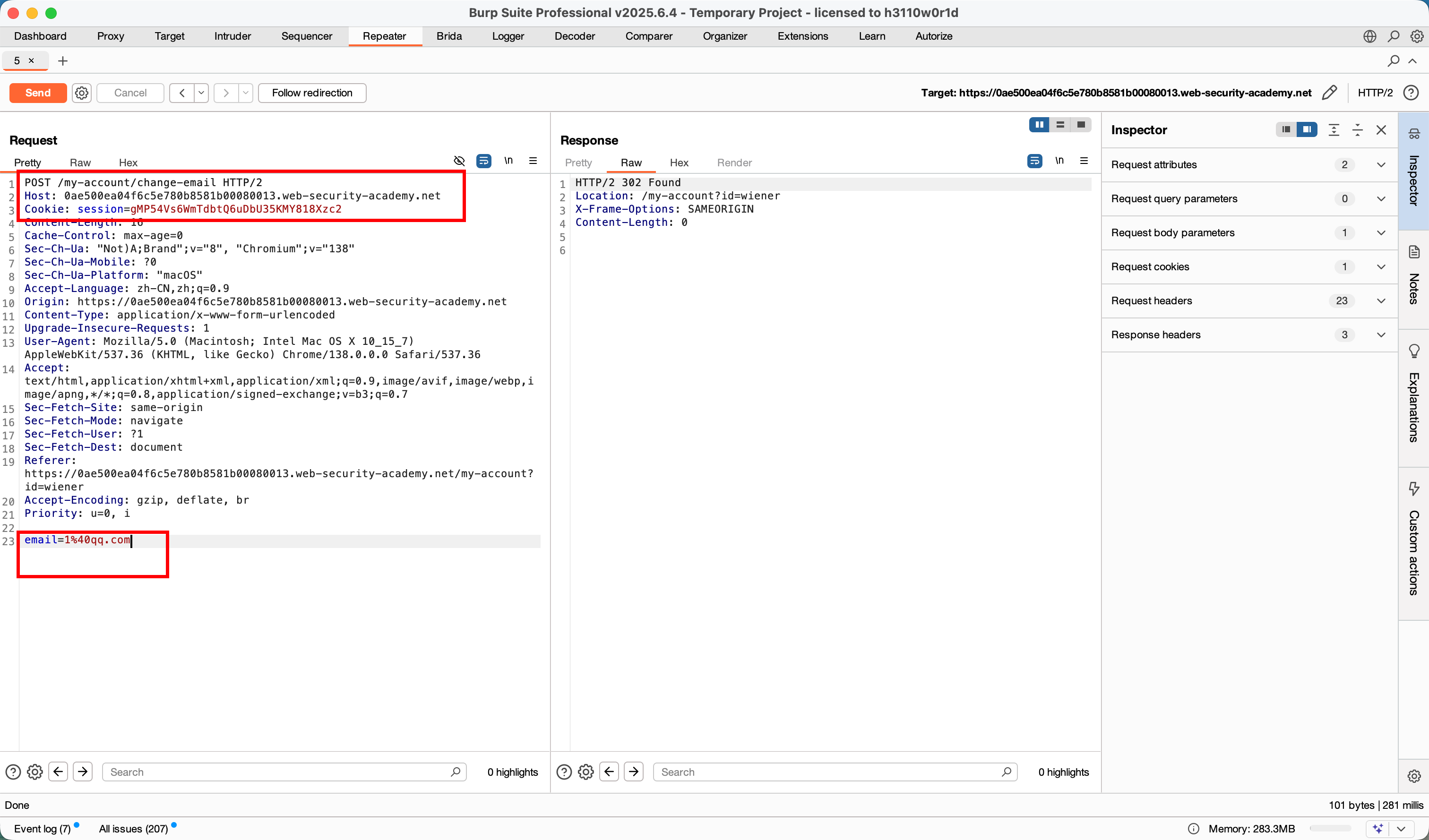 登录靶场,进入 “我的账户” 页面; - 打开 Burp Suite 并拦截 “更改邮箱” 的表单提交请求(确保浏览器代理已配置);
