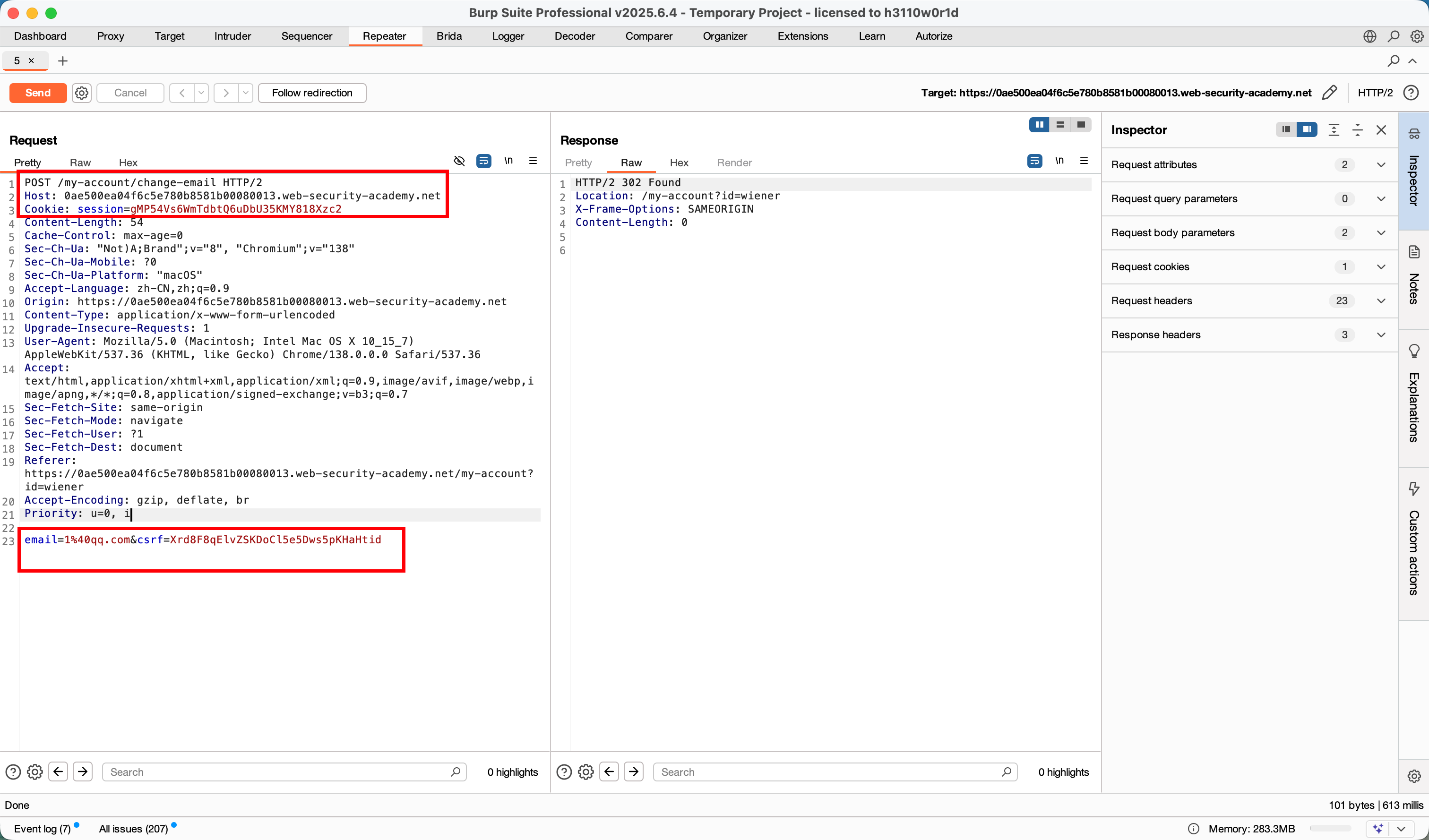 ,请求结构变为:发送请求后,观察响应:返回 302 重定向(跳转到账户主页)且账户邮箱实际已修改,说明删除令牌后防御失效(漏洞确认)。
