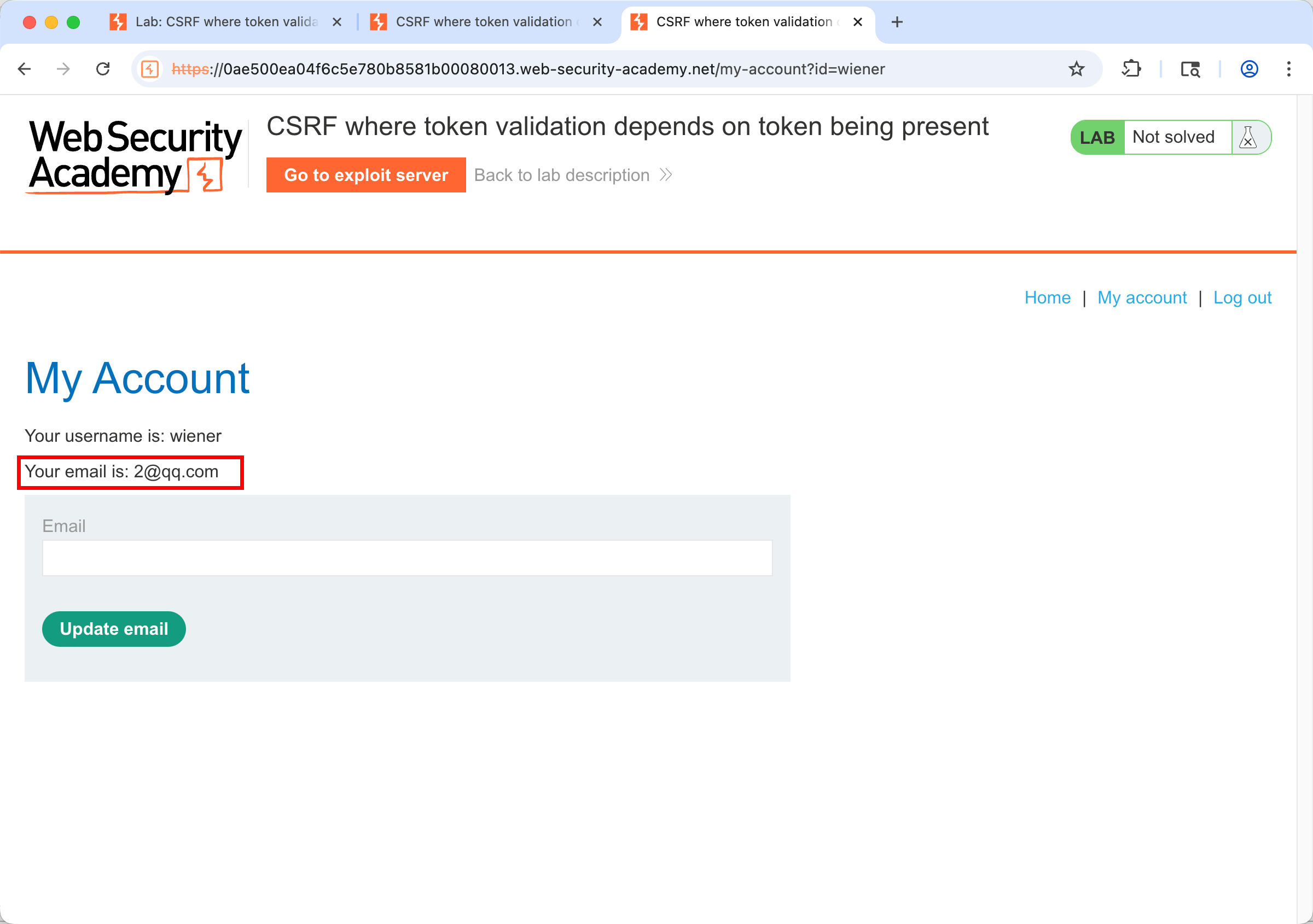 - 点击 “View Exploit” 查看恶意页面,此时浏览器会自动提交请求;验证邮箱是否修改:访问靶场 “我的账户” 页面,若邮箱已变为2@qq.com,说明攻击有效。