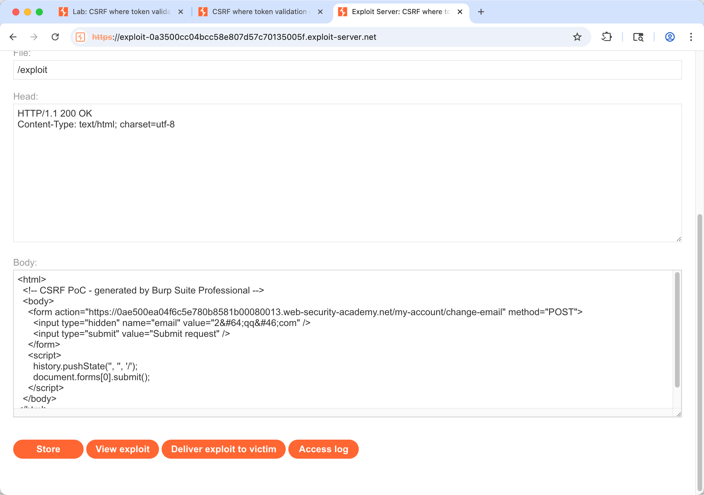 - 访问靶场的 “漏洞服务器”,将上述 HTML 粘贴到 “Body” 中,点击 “Store”;