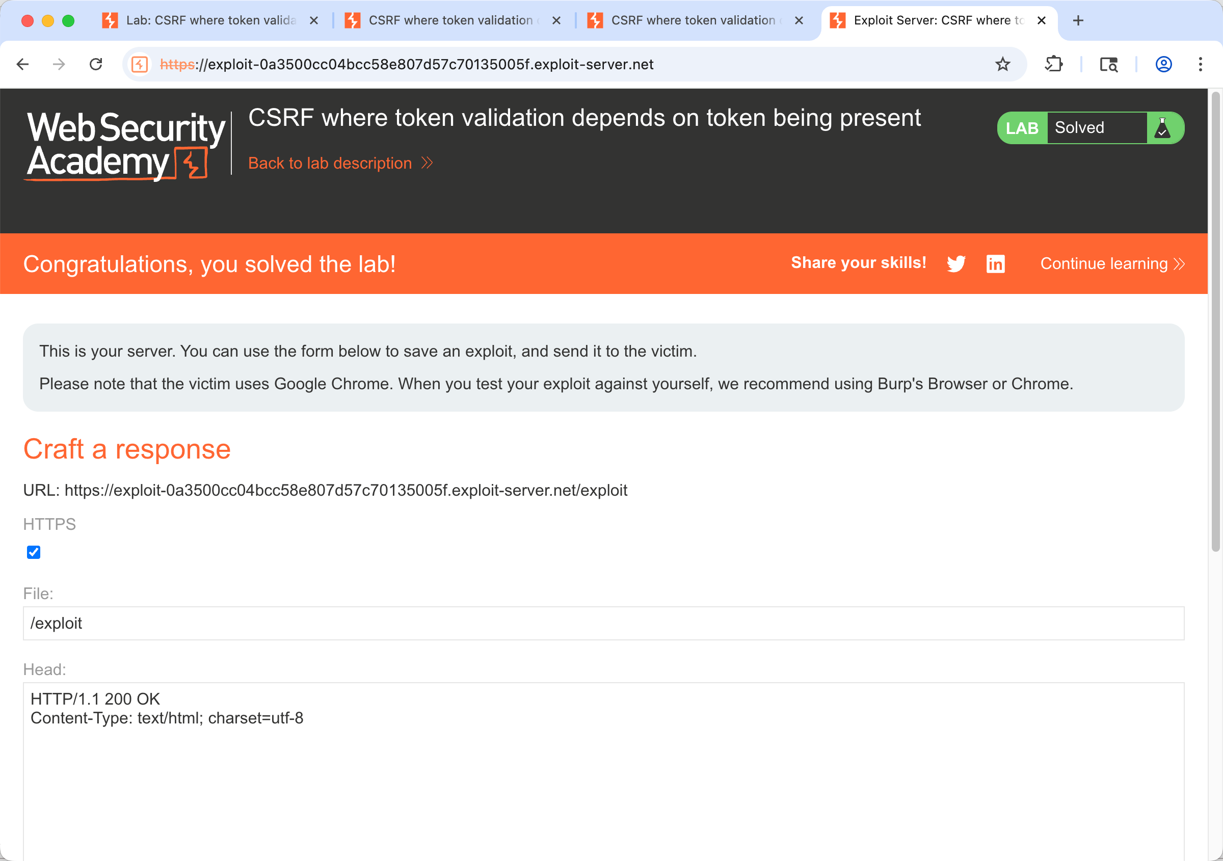 通过以上步骤,利用服务器 “仅检查令牌存在性” 的缺陷,即可成功绕开 CSRF 防御,完成靶场任务。