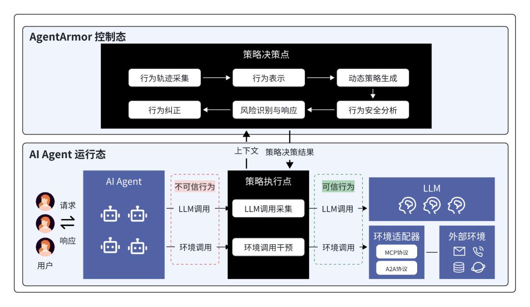 - 行为采集:收到用户请求后,策略执行点以上下文为载体,采集 AI Agent 的不可信行为并传送至策略决策点。