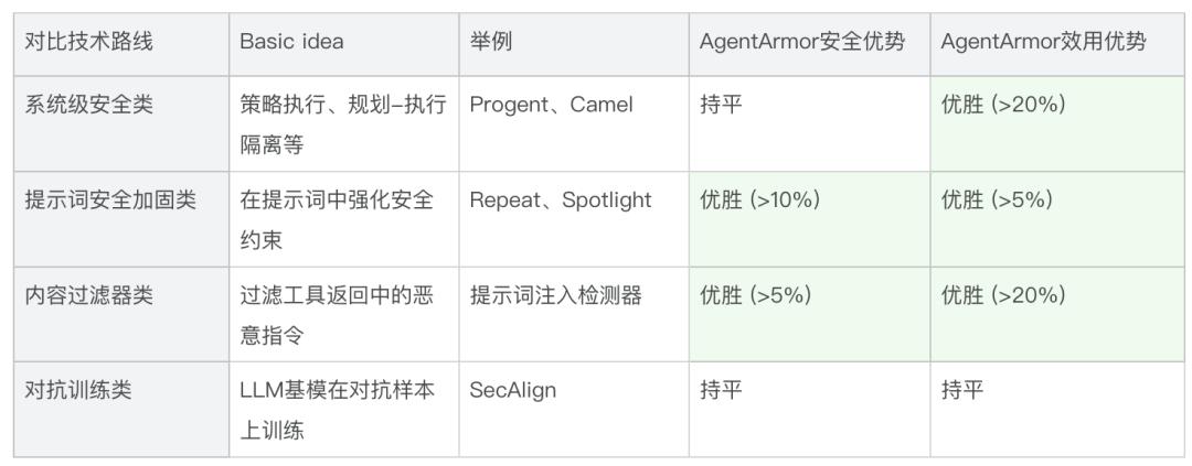 在与其他传统竞争技术路线对比中,AgentArmor 的安全防御能力(以攻击成功率下降幅度衡量)和效用维持能力(以正常任务完成率衡量)亦展现出显著的相对优势。