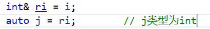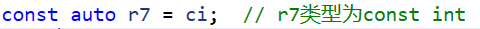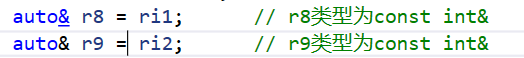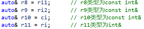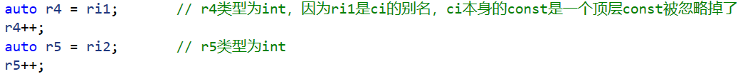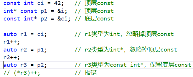{int i = 0;auto k = i; // k类型为intk++;int& ri = i;auto j = ri; // j类型为intj++;const int ci = 42; // 顶层constint* const p1 = &i; // 顶层constconst int* p2 = &ci; // 底层constauto r1 = ci; // r1类型为int,忽略掉顶层constr1++;auto r2 = p1; // r2类型为int*,忽略掉顶层constr2++;auto r3 = p2; // r3类型为const int*,保留底层const// (*r3)++; // 报错const int& ri1 = ci; // 底层constconst int& ri2 = i; // 底层constauto r4 = ri1; // r4类型为int,因为ri1是ci的别名,ci本身的const是一个顶层const被忽略掉了r4++;auto r5 = ri2; // r5类型为intr5++;const auto r7 = ci; // r7类型为const intauto& r8 = ri1; // r8类型为const int&auto& r9 = ri2; // r9类型为const int&auto& r10 = ci; // r10类型为const int&auto& r11 = ri; // r11类型为int&//r7++; // 报错//r8++; // 报错//r9++; // 报错//r10++; // 报错r11++;return 0;