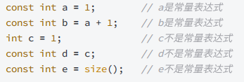 字⾯值、常量表达式 初始化的const对象 都是常量表达式,要注意 变量 初始化的const对象不是常量表达式。