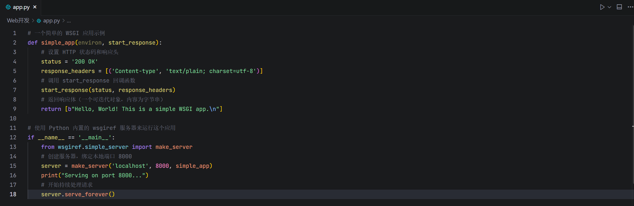 一个最简单的 WSGI 应用就是一个可调用对象(比如函数),它接受 environ