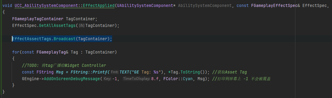if (CC_AbilitySystemComponent == nullptr){CC_AbilitySystemComponent = Cast<UCC_AbilitySystemComponent>(AbilitySystemComponent);}CC_AbilitySystemComponent->EffectAssectTags.AddLambda([](const FGameplayTagContainer& AssectTags){for(const FGameplayTag& Tag : AssectTags){//TODO: 将tag广播给Widget Controllerconst FString Msg = FString::Printf(TEXT("GE Tag: %s"), *Tag.ToString()); //获取Asset TagGEngine->AddOnScreenDebugMessage(-1, 8.f, FColor::Cyan, Msg); //打印到屏幕上 -1 不会被覆盖}});