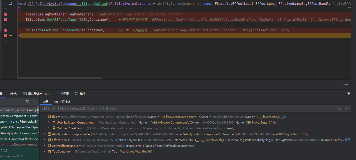 2.在小部件控制器中,调用ASC中的EffectAssectTags的委托回调函数: