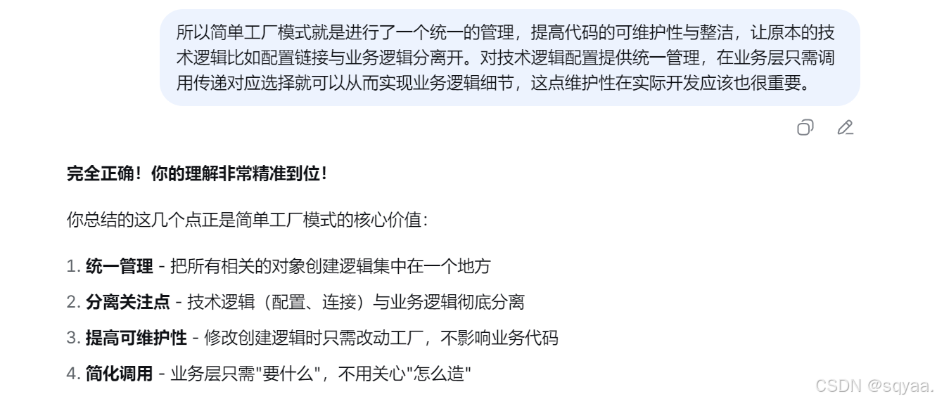 场景 不使用工厂 使用简单工厂 改数据库密码 需要修改UserService, OrderService... 等所有用到的地方 只需要修改ConnectionFactory一个地方 添加新数据库 要在每个需要的地方添加新的创建逻辑 只在ConnectionFactory中添加一个新分支 代码复杂度 每个Service都包含技术细节,代码臃肿 每个Service都很干净,只关注业务逻辑 出错概率 容易在某个Service里写错配置 配置集中管理,保证一致性