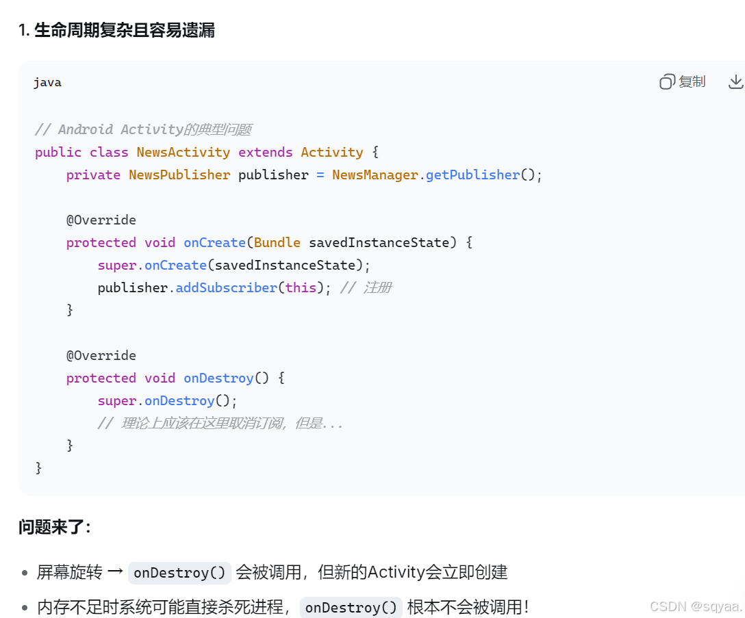 生命周期与内存泄漏:特别是在客户端,如果观察者(如一个UI页面)被销毁前没有及时取消注册,就会导致被观察者持有它的引用,无法被垃圾回收,从而引发内存泄漏。