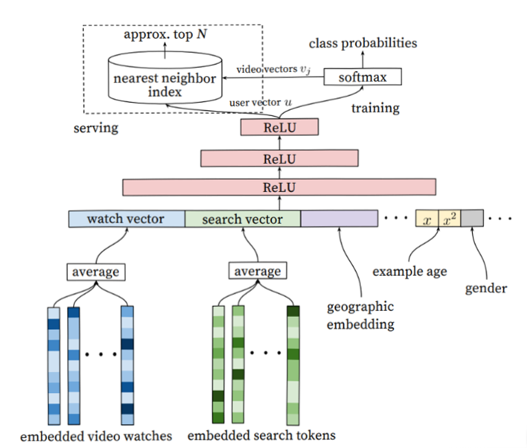 召回阶段:通过用户观看历史、搜索词、地理位置等特征,使用三层ReLU全连接层生成用户向量,结合Softmax层预测视频点击概率。