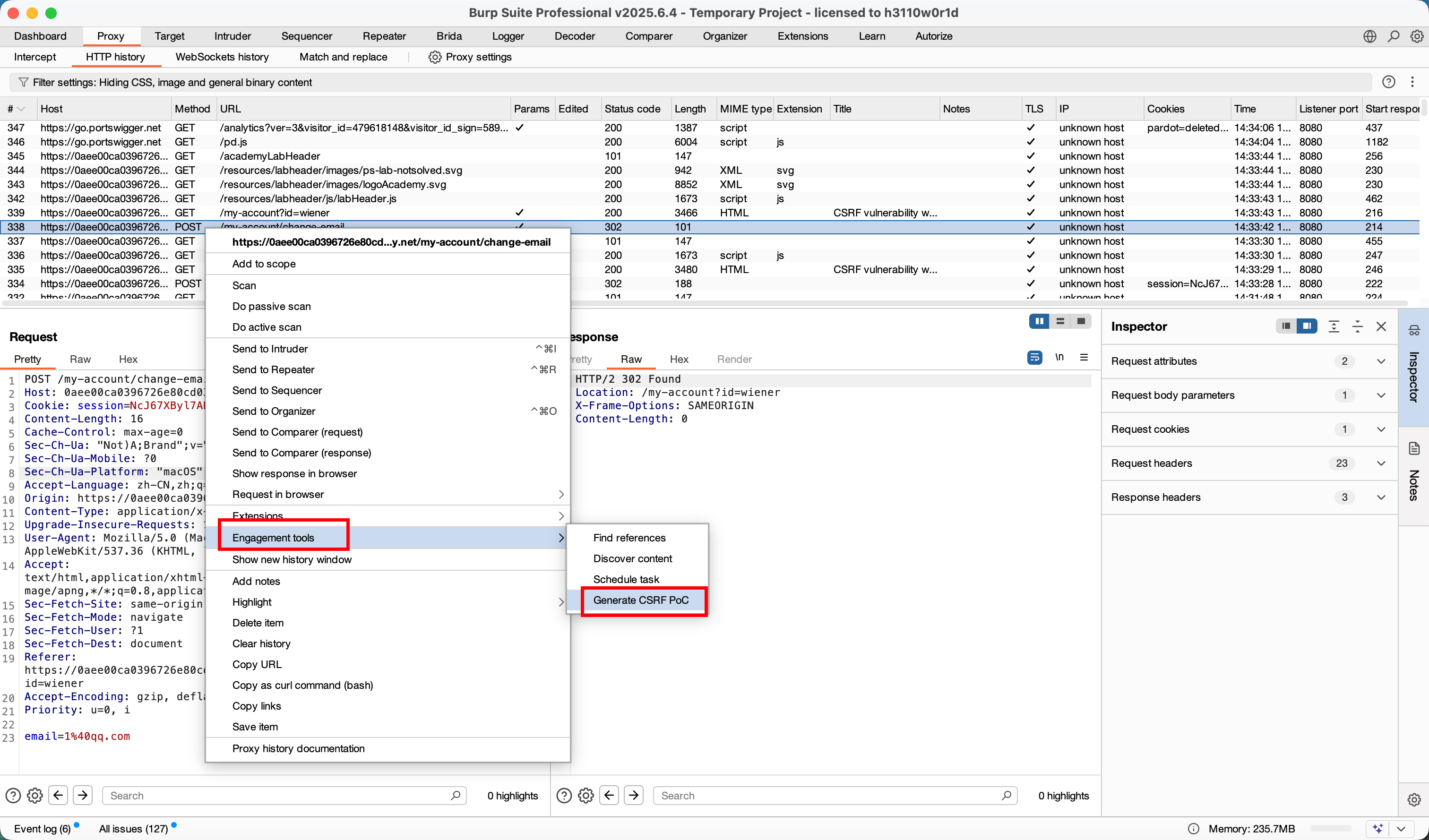 - 选择 Engagement Tools → Generate CSRF PoC(生成 CSRF 攻击代码);