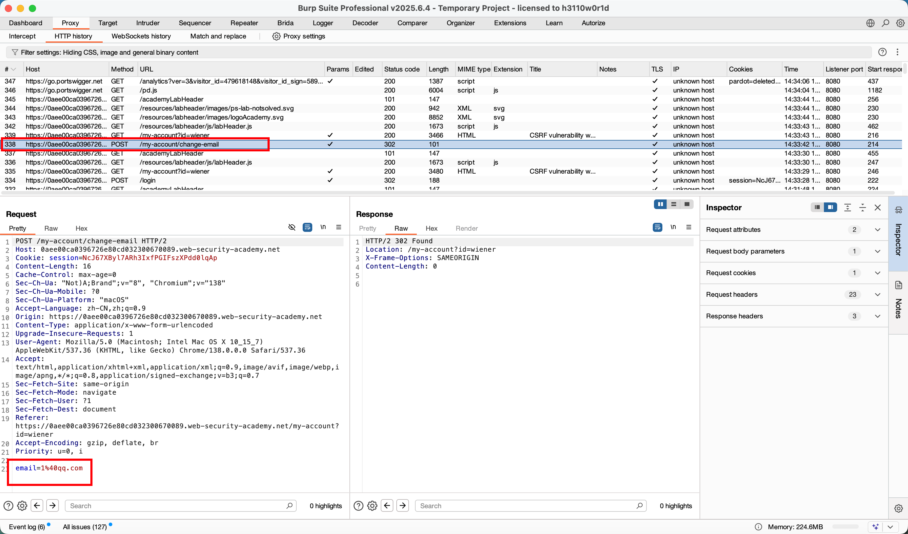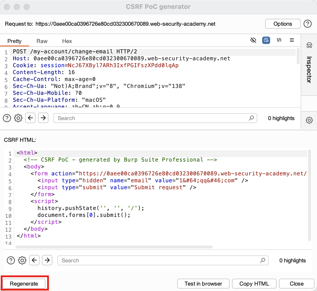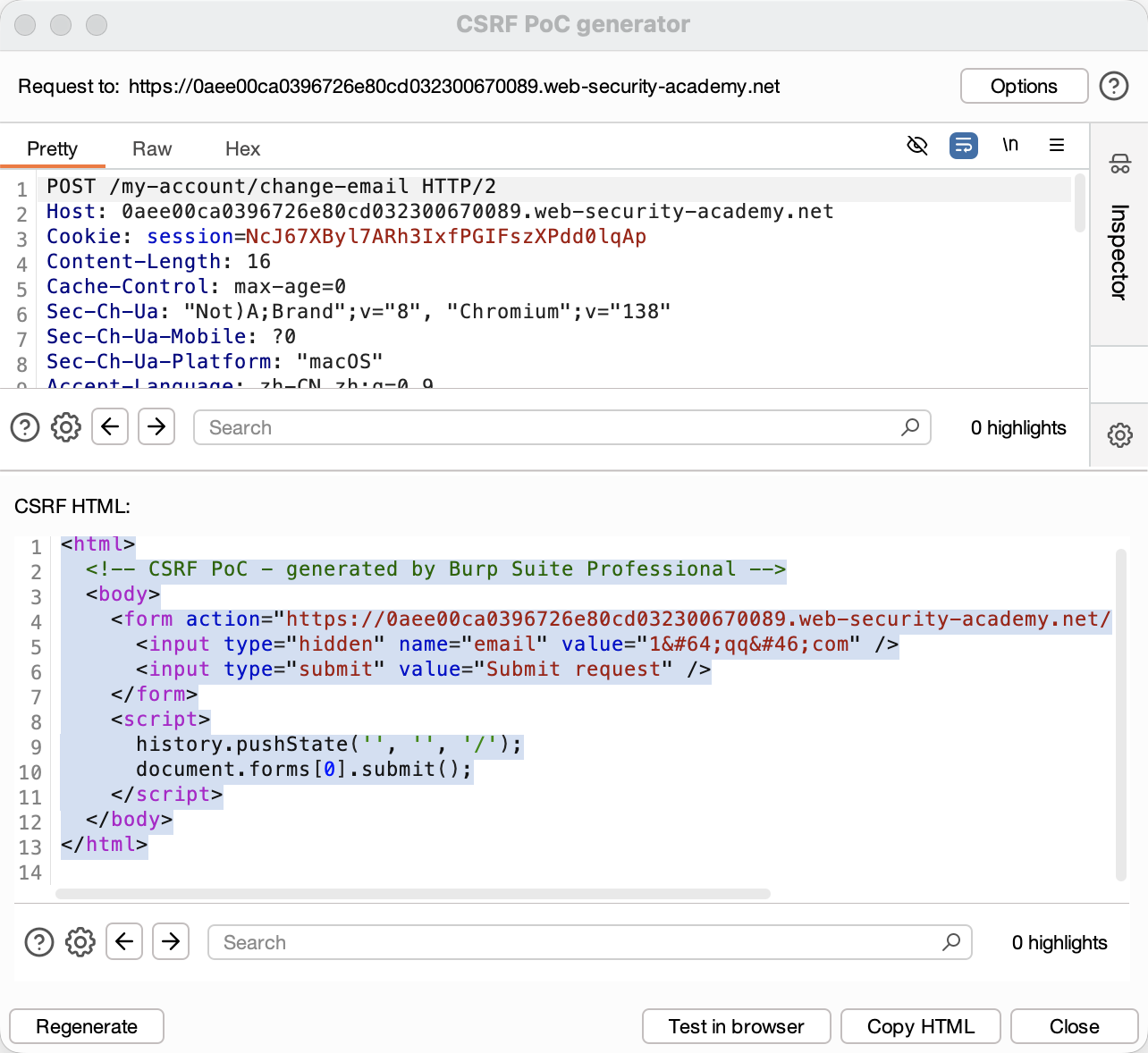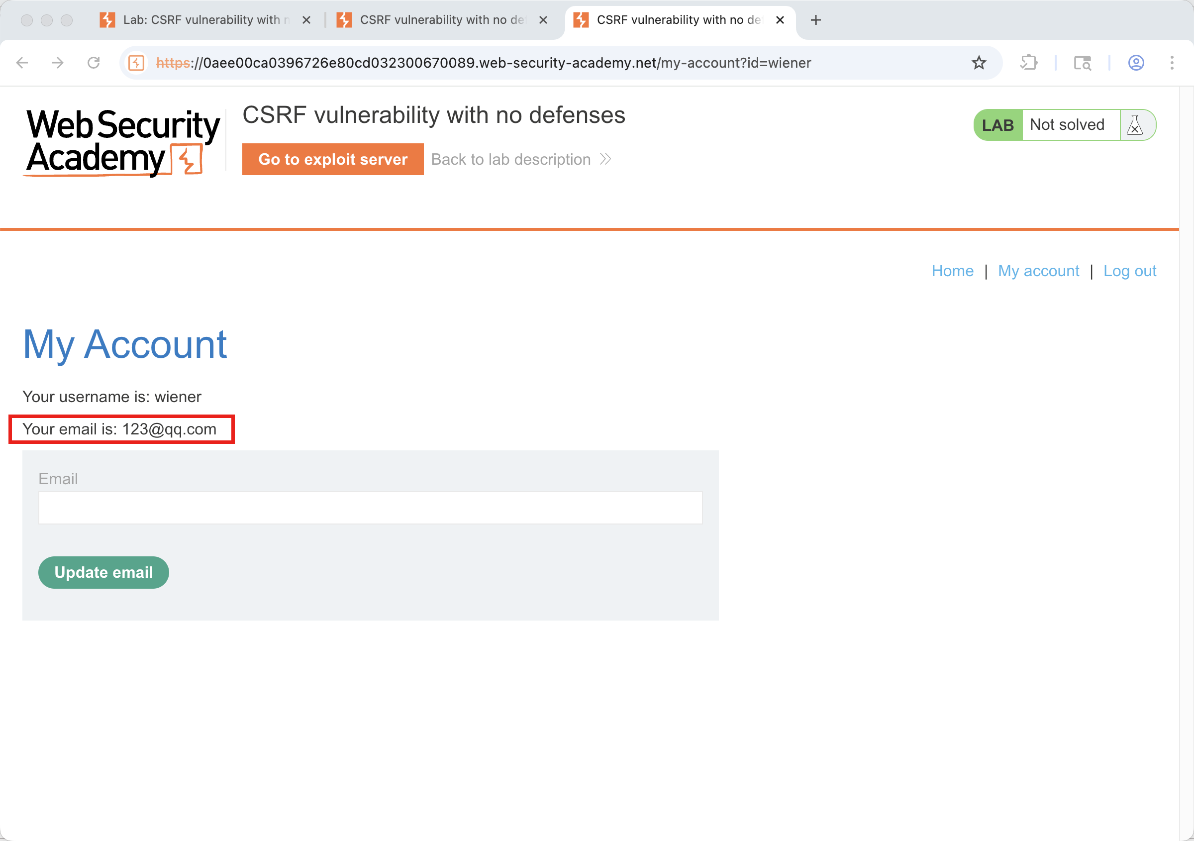 - 页面会自动跳转回靶场的 “我的账户” 页面,刷新后查看 “邮箱” 字段 —— 若已变为你在恶意 HTML 中设置的邮箱,说明 CSRF 攻击有效;