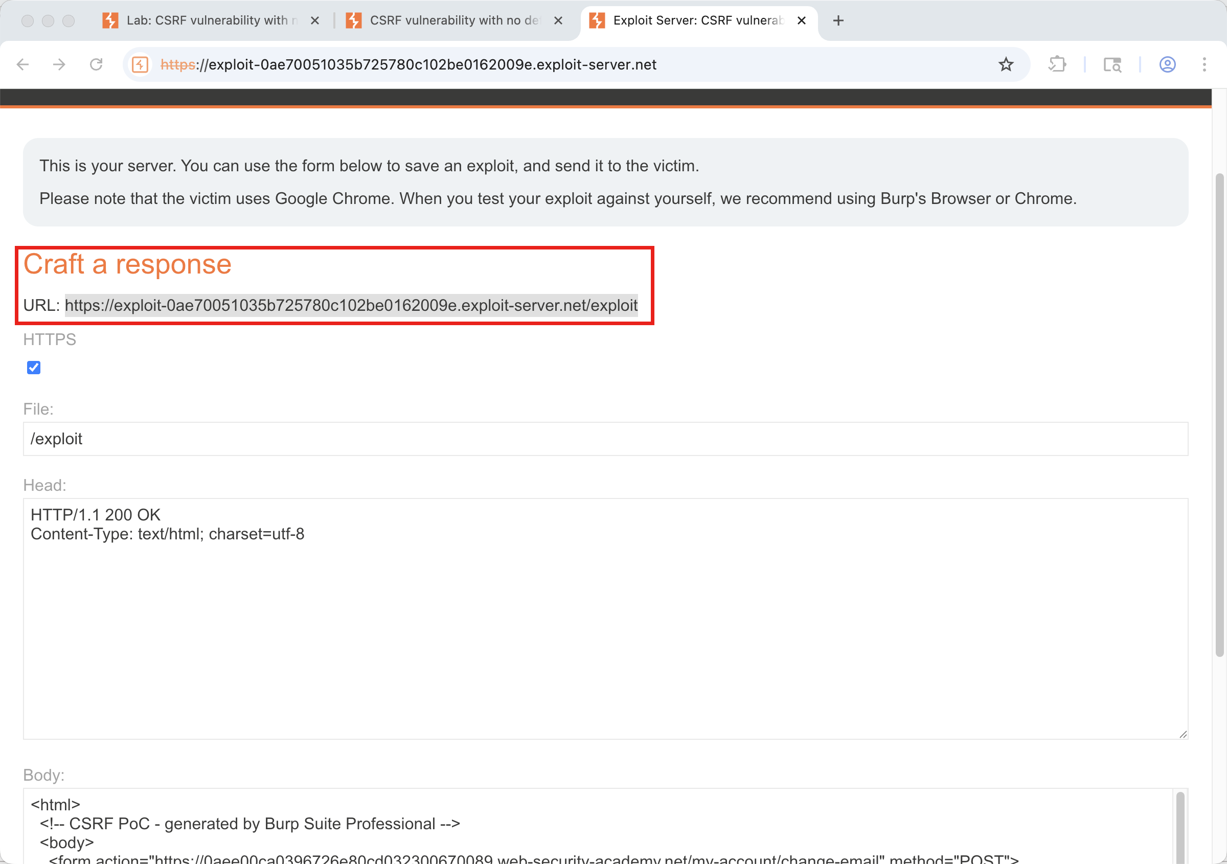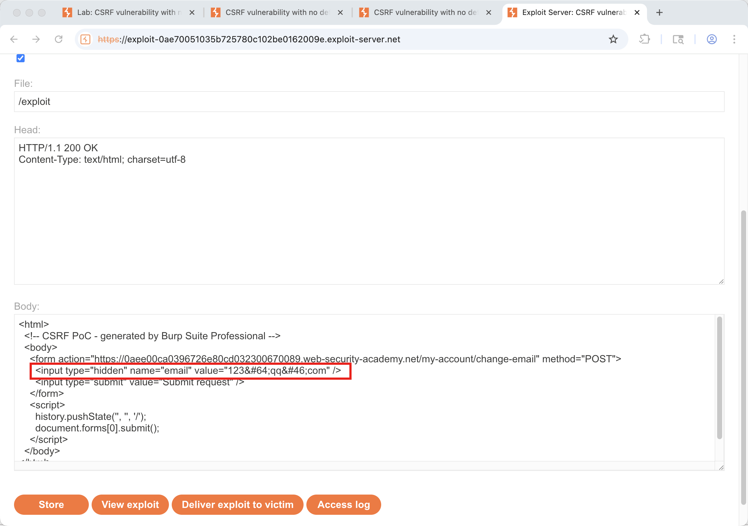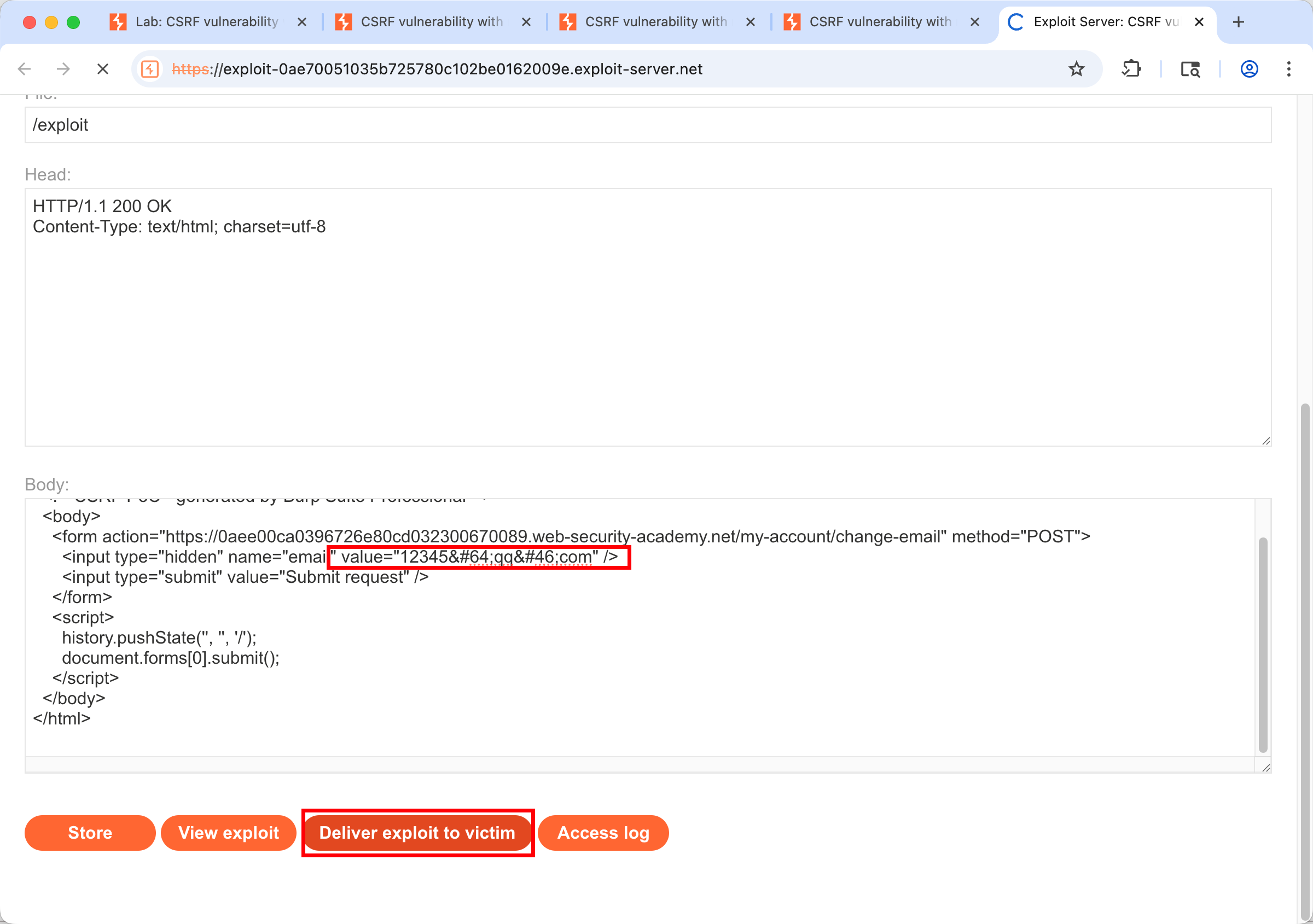 ,否则需要用户手动点击表单按钮才能触发攻击,无法实现 “不知情触发”; - 认证状态依赖:CSRF 攻击的前提是 “受害者已登录靶场”,靶场的 “Deliver to Victim” 功能会自动模拟受害者的已登录状态,无需额外操作;