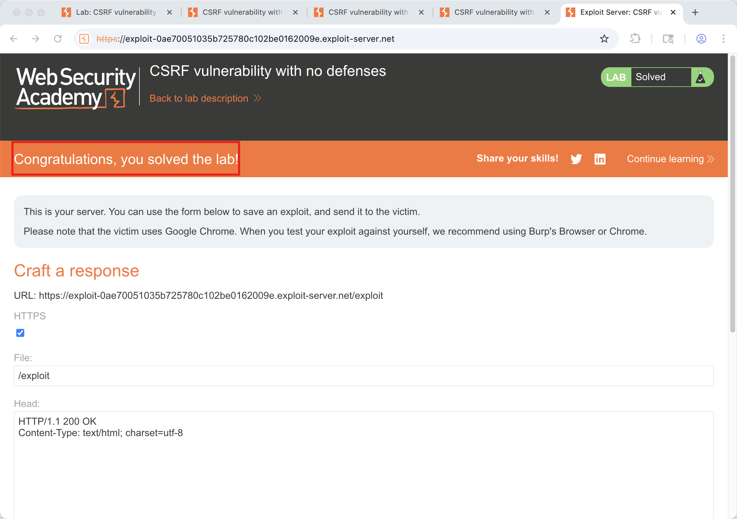通过以上理论理解和实践步骤,即可成功利用无防御的 CSRF 漏洞,完成靶场任务。